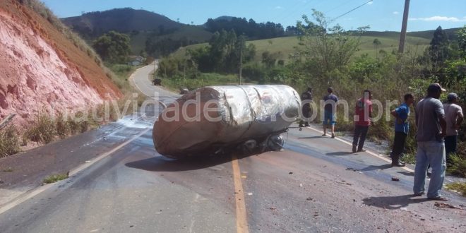 Um caminhão Mercedes Benz, de cor azul, carregado de leite, tombou no final da tarde desta quarta-feira (26), na RJ 214, zona rural de Varre-Sai. De acordo com informações apuradas pelo jornalismo da Rádio Natividade, o condutor do veículo que estava prestando serviços para a empresa “Quatá”, perdeu o controle da direção ao não concluir uma curva, nas proximidades da comunidade da Prata, tombando às margens da rodovia. Com o impacto, o tanque chegou a se soltar da carroceria, espalhando o alimento pela via. O motorista que não teve a identidade confirmada, teria sofrido leves escoriações e passa bem.