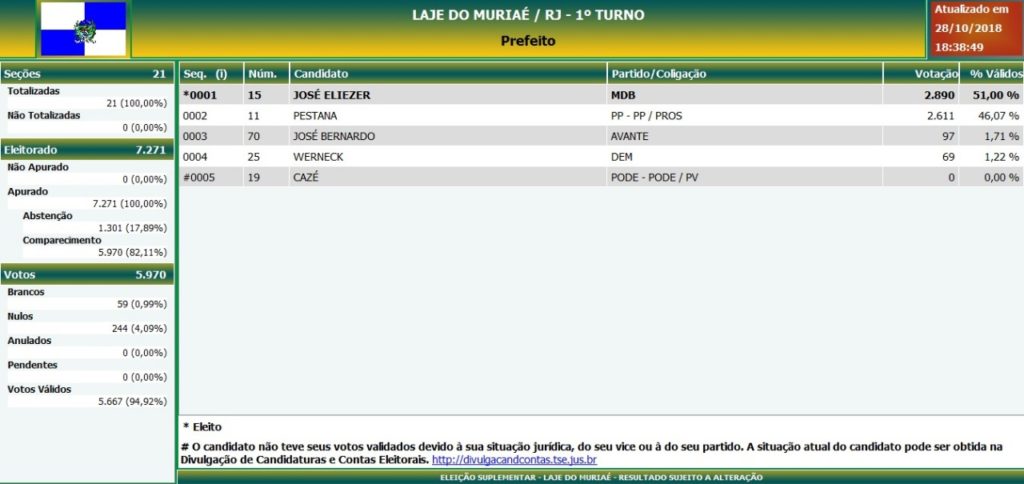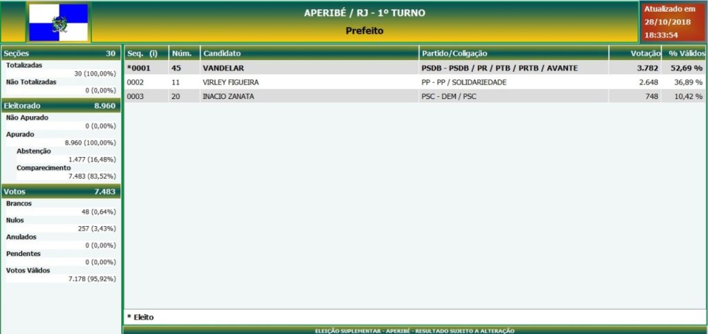 Paralelo às eleições gerais de 2º turno, eleitores de dois municípios do Noroeste Fluminense, elegeram em pleito suplementar, seus novos prefeitos ( os anteriores tiveram os mandatos caçados). Em Laje do Muriaé, o escolhido foi o ex-prefeito José Eliezer (MDB), reconduzido ao cargo após bater com 51% dos votos válidos o ex-jogador de futebol Pestana (PP), que alcançou 46,07%. Já em Aperibé, vitória de Vanderlar (PSDB), com 52,69%. Confira os resultados: