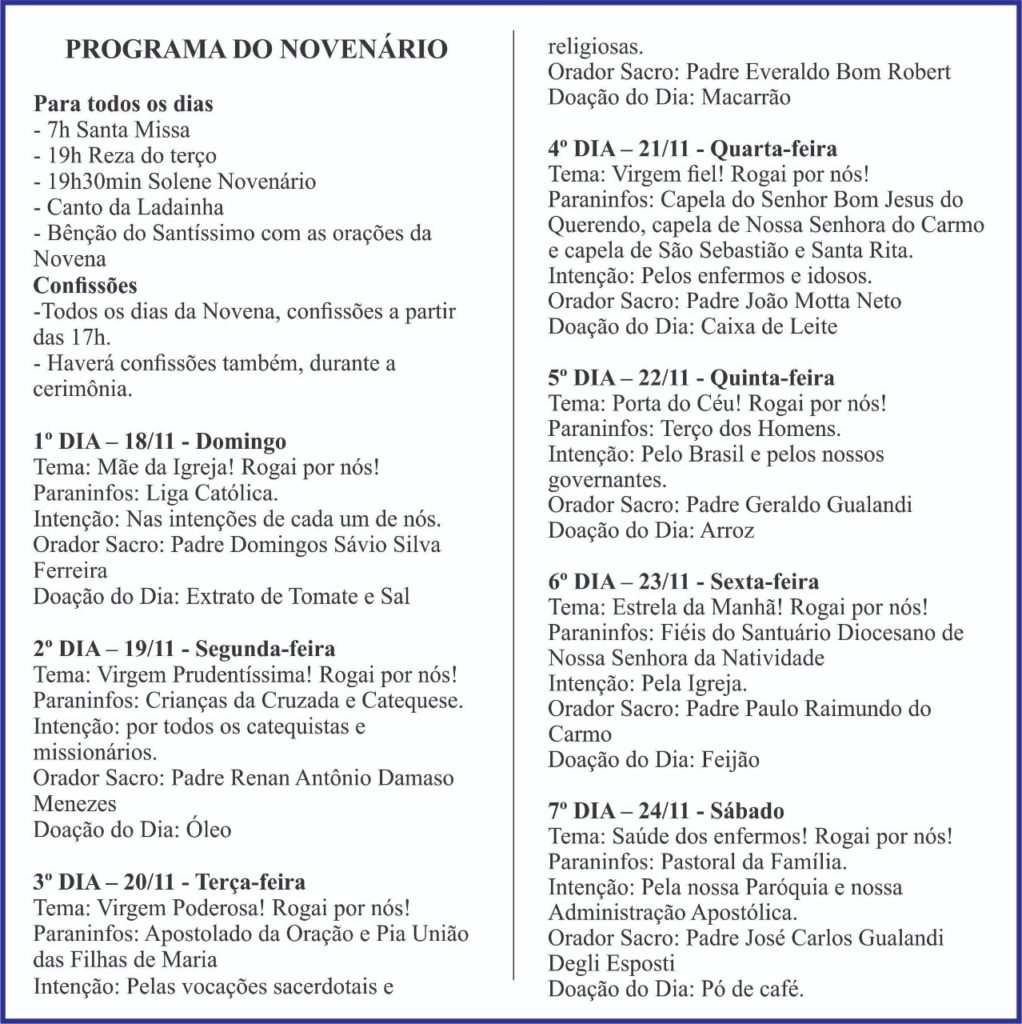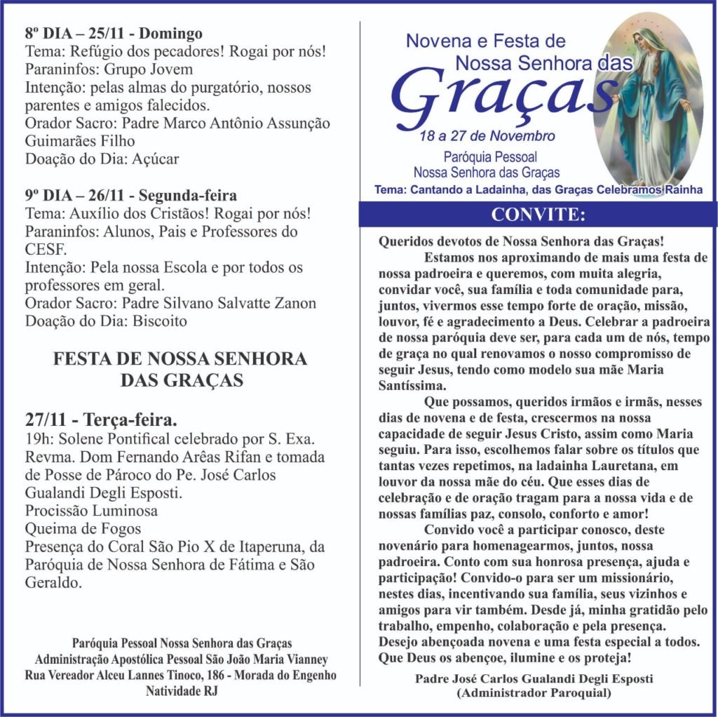 Terá início neste domingo (18), o novenário em louvor à Nossa Senhora das Graças, na paróquia pessoal da qual é padroeira em Natividade. Em razão disso, o padre José Carlos Gualandi, visitou a Rádio Natividade, onde ao conversar com o jornalista Vanderson Garcia, convidou aos fieis para os atos, preparatórios à festa maior, que acontece no dia 27 de novembro. Confira a programação abaixo e ouça: