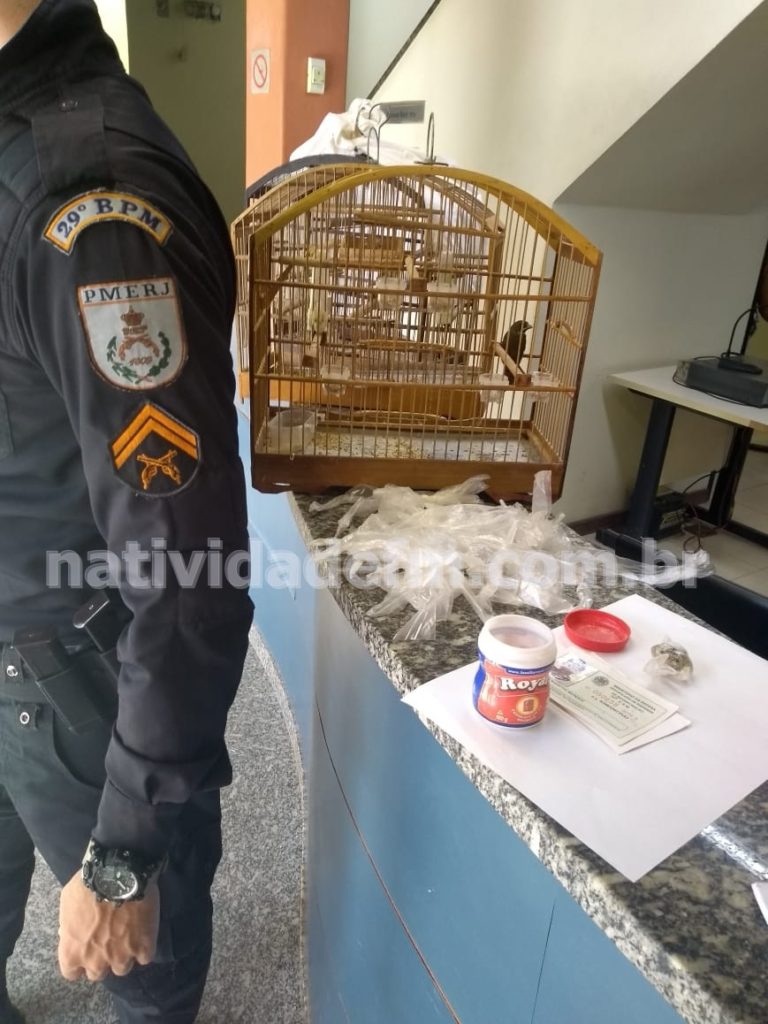 Na manhã desta terça-feira (29), militares do Patrulhamento Tático Móvel (PATAMO I), da 3ª Companhia do 29º BPM detiveram um rapaz, no bairro Grenville, Porciúncula. Os sargentos Prevato/Eduardo e cabos Marquioti/França, verificavam informação de tráfico, no Morro da Macaca, onde interior da residência de J.M.M., de 22 anos, localizaram quatro pássaros da fauna brasileira sem registro, 1,9 grama de maconha, 2,9 gramas de cocaína, pote de fermento em pó, além de material para endolação. A ocorrência seguiu para registro na 139ª Delegacia e o suspeito, responderá em liberdade por crime ambiental e posse de entorpecentes.