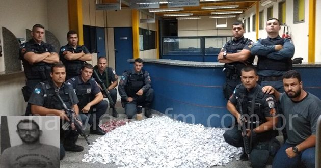 No início da madrugada deste domingo (17), um elemento foi preso com grande quantidade de entorpecentes, no bairro Aeroporto, Itaperuna.  Equipes do 29º BPM, verificavam denúncia anônima e conseguiram abordar o Volkswagen modelo Voyage de cor branca/placa de Itaperuna, na Rua Bom Jesus, encontrando a droga no porta-malas do veículo. Segundo a PM são 4.724 pinos de cocaína, 109 “mariolas” e um tablete de maconha, totalizando quase sete quilos das substâncias. O motorista, Robson Roriz de Freitas, de 39 anos (detalhe na foto), foi levado até a 143ª Delegacia, sendo autuado em flagrante por tráfico, devendo ser transferido ao sistema prisional nas próximas horas.