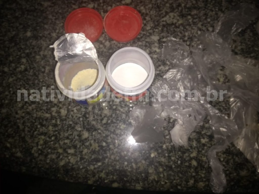 Na noite desta quarta-feira (06), um suspeito de tráfico foi preso no bairro Vila da Paz, Natividade. Equipes do Patrulhamento Tático Móvel (PATAMO I e II – sargentos Prevato/Eduardo e cabos França/Lacerda e Aguiar) ) verificavam denúncia anônima e seguiram atá a residência de Cristiano Campos Cardoso, o “Onze” de 39 anos, onde após buscas, localizaram dois potes com cocaína e fermentos em pó, usado geralmente para misturar a droga, além de material para endolação.