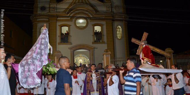 Centenas de fieis das Paróquias Santuário de Nossa Senhora da Natividade e Nossa Senhora das Graças se reuniram na noite desta quarta-feira (17), para a Procissão do Encontro, que recorda o doloroso encontro de Jesus e Maria a caminho do calvário. O rito é marcado pela junção das imagens de Nosso Senhor dos Passos e de Nossa Senhora das Dores, que saem de pontos diferentes da cidade.