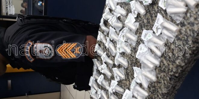 Uma carga de cocaína foi apreendida na noite desta segunda-feira (13), na comunidade do Morro do Marca-Tempo, na área central de Itaperuna. Equipes do 29º BPM seguiram para o local para verificar denúncia e após trabalho de monitoramento e vigilância, avistaram o elemento identificado pelas iniciais D.M.P., de 20 anos, na Rua Balbino Moreira Rodrigues, que ao perceber a iminente abordagem, abandonou a sacola que levava, no interior da qual estavam 170 pinos de cocaína e dez buchas de maconha e conseguiu fugir através de área de difícil acesso. Mesmo não localizado, acabou autuado por tráfico de drogas na 143ª DP, onde o entorpecente permaneceu apreendido.