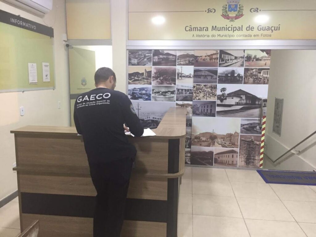 O Ministério Público do Estado do Espírito Santo, por meio da Promotoria de Justiça de Guaçuí e do Grupo de Atuação Especial de Combate ao Crime Organizado (Gaeco), com apoio do Núcleo de Inteligência da Assessoria Militar do MPES e da Polícia Militar, deflagrou nesta quinta-feira (16), a Operação Ouro Velho, na Região Sul do Estado. O objetivo é desarticular uma organização criminosa formada por servidores públicos de setores da prefeitura e da Câmara Municipal de Guaçuí que atuam para obter direta e indiretamente vantagem econômica com a prática de diversas infrações penais. Sete pessoas foram presas, incluindo dois secretários municipais e o presidente da Câmara de Guaçuí.
