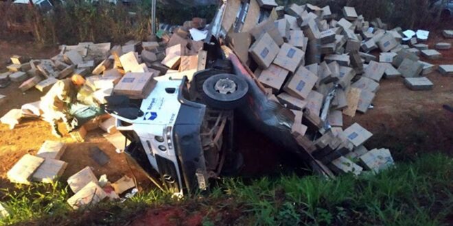Um grave acidente deixou duas pessoas – homens de 53 e 30 anos – feridas no início da manhã desta segunda-feira (20) na RJ-116, na entrada da localidade da Serrinha, em Aperibé. Um caminhão não conseguiu completar a curva e capotou, por volta das 5h20, na altura do quilômetro 203. O veículo transportava papelão e pertence a uma empresa de embalagens de Santo Antônio de Pádua. As vítimas foram identificadas de 53 anos e 30 anos, foram socorridas por bombeiros e levadas para o Hospital Municipal de Itaocara por uma ambulância da unidade.