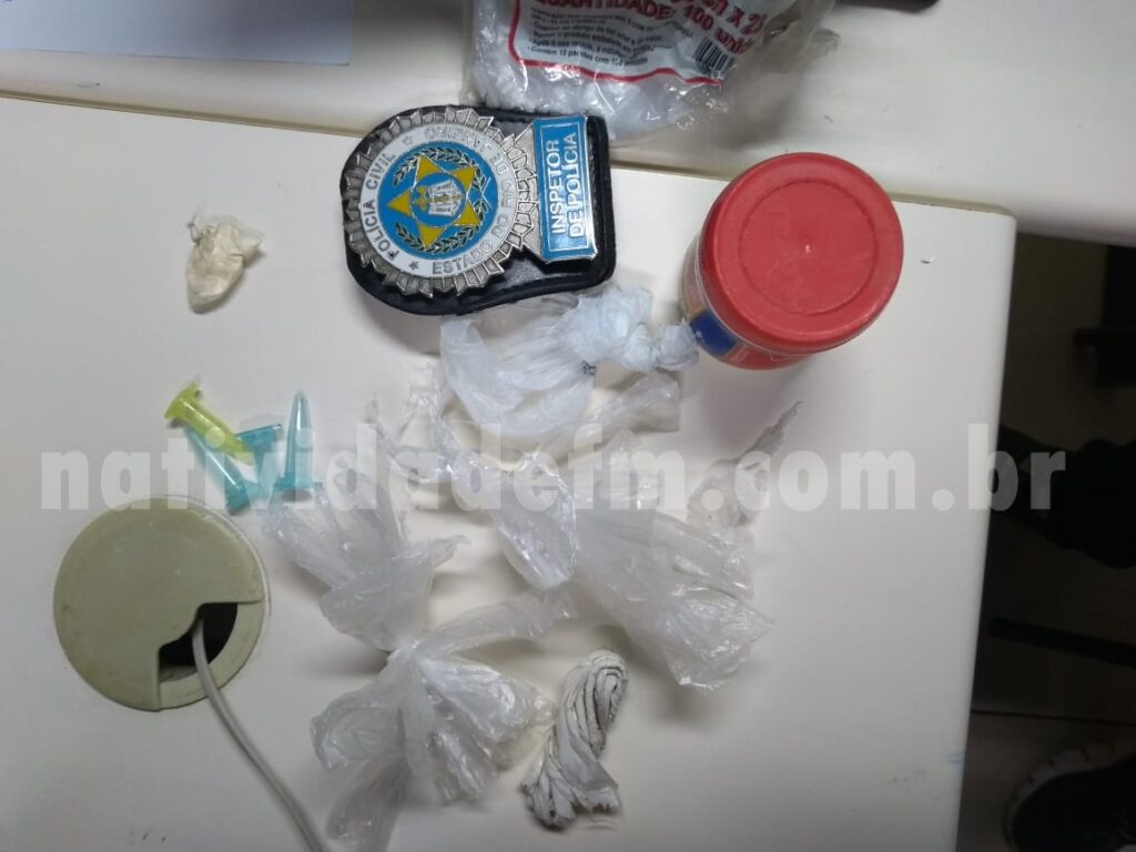 Desta vez, ação conjunta entre militares do Patrulhamento Tático Móvel (PATAMO – sargentos Prevato/Eduardo, cabos França/Marquioti), do 29º BPM e os agentes Néritow Bertholino, Lucas Miranda e Edmar Simões, da 139ª Delegacia, de posse de mandado de busca expedido pela Justiça, se deslocaram até a Rua Rua Achiles Vieira Folly, onde aprenderam um papelote de cocaína, pinos vazios e material para endolação.