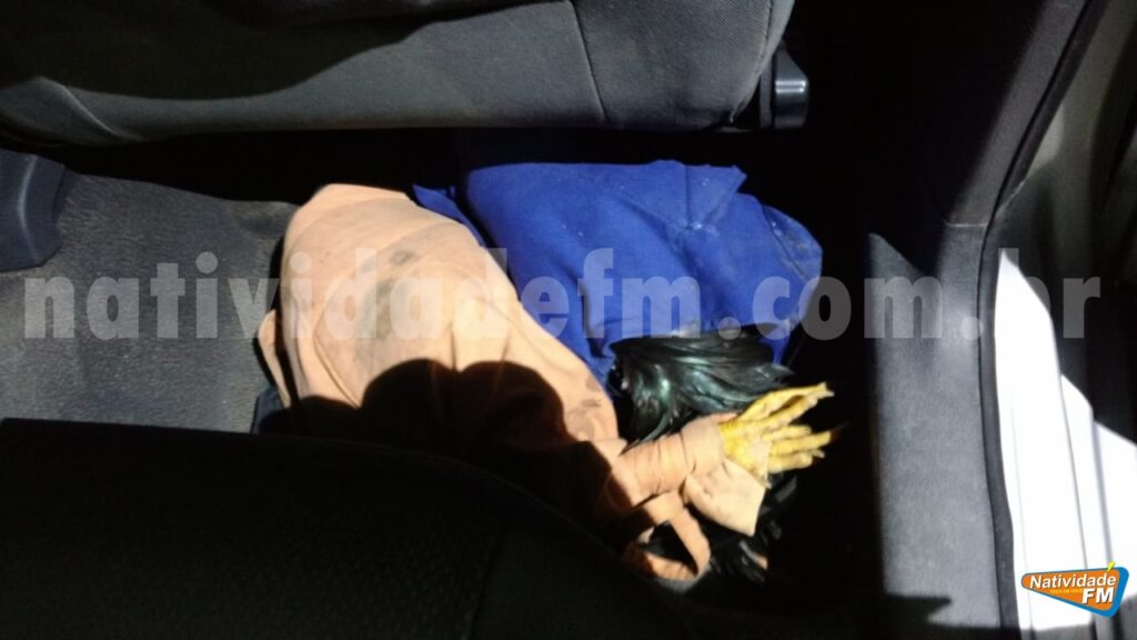 Um veículo Polo Sedan de cor prata, foi abandonado e em seu interior, encontrados quatro galos imobilizados sob os bancos e uma carteira de couro preta com a quantia de R$2.672,00 e documentos em nome de S. E. da S. T. que foram recolhidos.