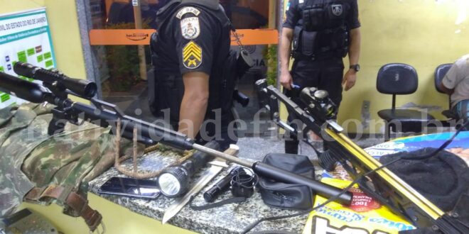 Dois elementos que seriam caçadores, foram detidos na madrugada desta terça-feira (28), por militares do 29º BPM, no bairro Nossa Senhora da Penha, Porciúncula. A equipe do Patrulhamento Tático Móvel (PATAMO) realizava ação de rotina, quando na “Estrada da Cachoeirinha”, desconfiou do Fusca na qual estavam R.A e J.O., de idades não confirmadas, que dentro de veículo, transportavam armas de caça (não de fogo), fardas camufladas, armadilhas, lanternas e outros materiais. Levados até a 139ª Delegacia, acabaram autuados e responderão em liberdade.
