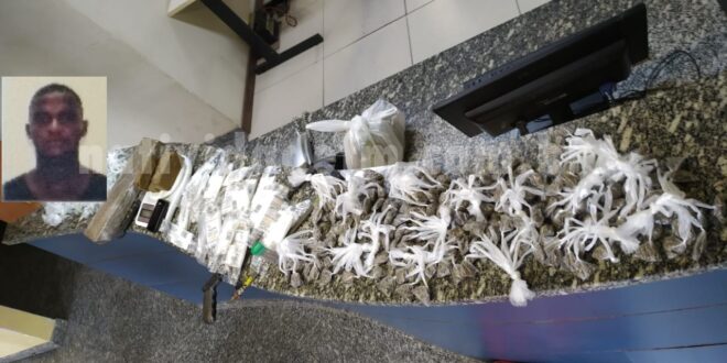 Ação deflagrada na tarde desta quarta-feira (14), por militares do 29º BPM resultou na prisão de um suspeito e a apreensão de quase dois quilos de entorpecentes, no bairro Vale Verde, Porciúncula. A equipe do Patrulhamento Tático Móvel (PATAMO – sargentos Prevato/Eduardo – cabos Marquioti/França, sob a supervisão do tenente Dhiones, comandante da 3ª Companhia), passou a partir de denúncia, a realizar diligências, monitorando Cristiano Bernardo da Silva, de 27 anos (detalhe na foto), localizado na casa da namorada, na Rua Paulo Vieira Gustavo e onde no interior de uma mala, estavam quatro tabletes e 224 buchas de maconha, 175 pinos de cocaína, balança de precisão e material para endolação, além de seis munições calibre 32. Conduzido até a 139ª DP, o envolvido acabou autuado em flagrante por tráfico, devendo ser transferido ao sistema prisional.