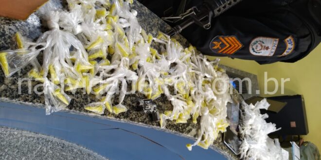 Denúncia de tráfico terminou com a apreensão de grande quantidade de entorpecente já pronto para a comercialização, no final da tarde desta quinta-feira (12), no bairro Santo Antônio (Grenville), Porciúncula. Militares do Patrulhamento Tático Móvel (PATAMO), realizaram buscas pelo interior de uma das residências na Rua Manoel Bertholino da Silva, onde se encontravam três pessoas, encontrando centenas de sacolas plásticas vazias.