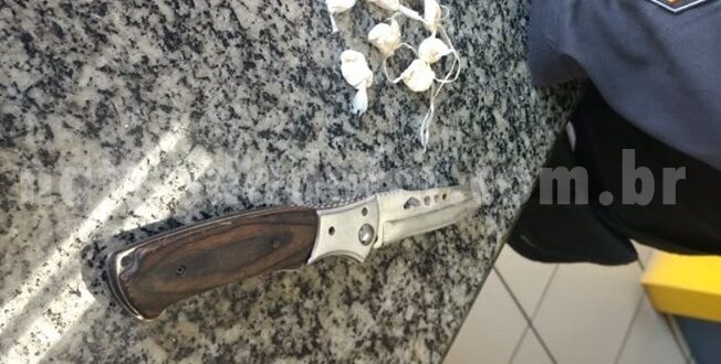 Uma denúncia de que elemento armado de canivete estaria batendo em portões de residências, levou militares do 29º BPM até o Loteamento São José, no início da manhã deste sábado (05). Na Rua Lupercy Peres Duarte, eles se depararam com G.C.S.J., de 31 anos, com uma mochila nas costas e a lâmina na cintura, além de oito sacolés de cocaína, que segundo ele, seria para o consumo próprio. Autuado na 148ª DP, responderá em liberdade.