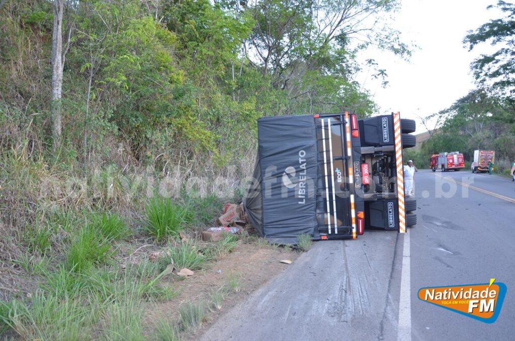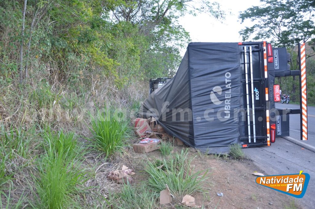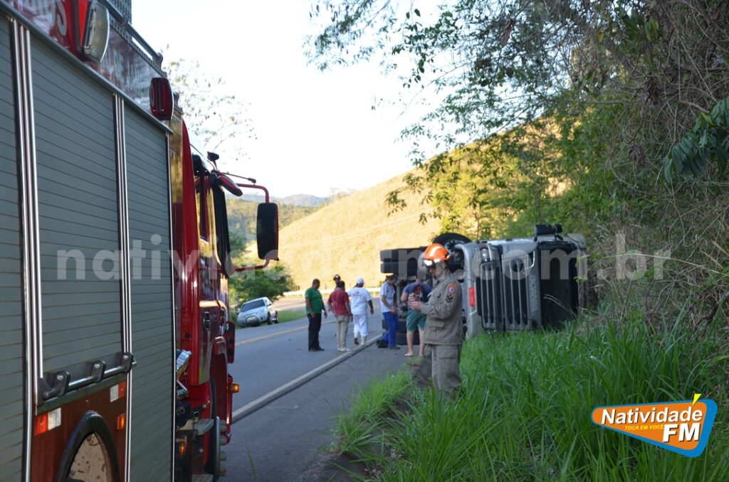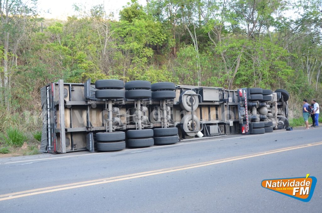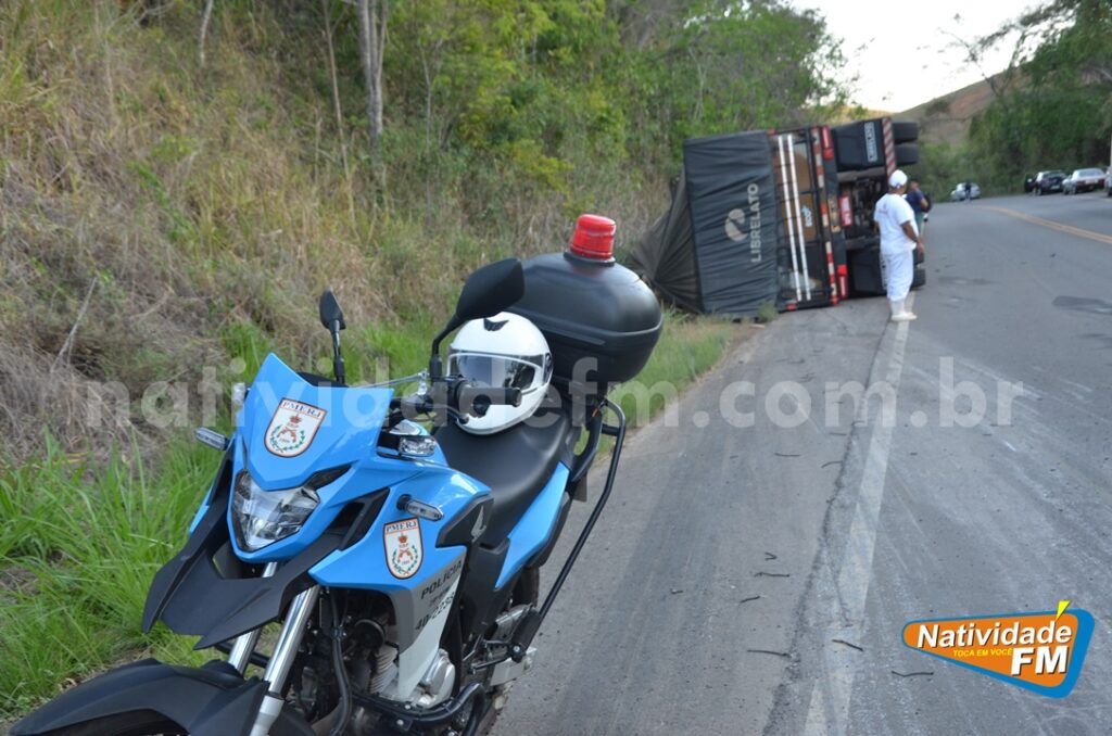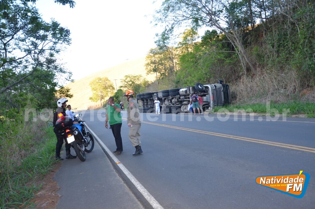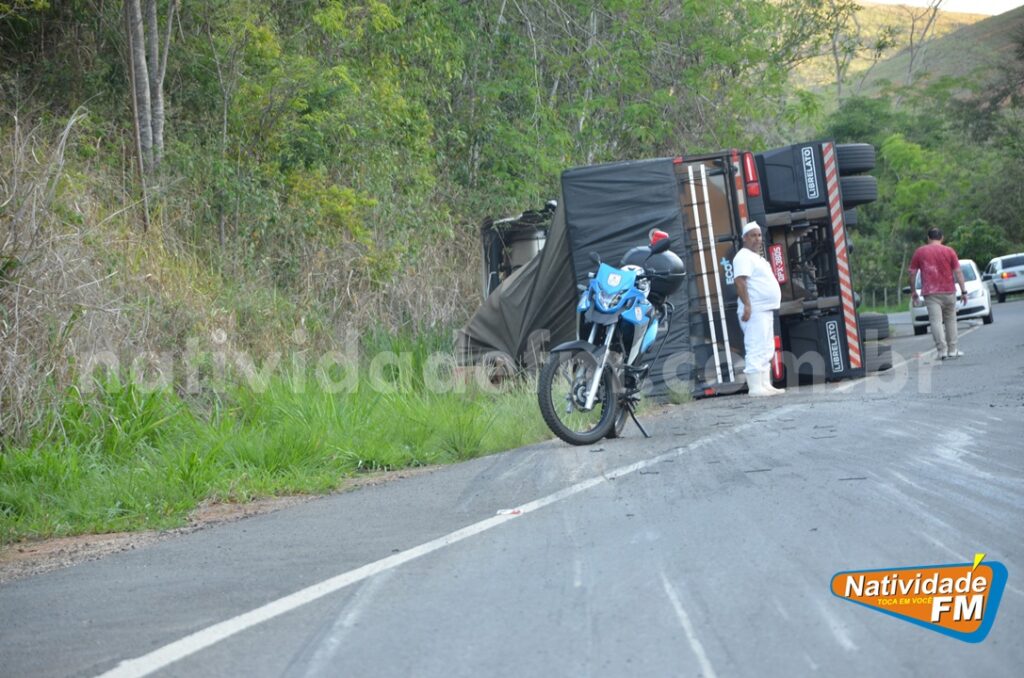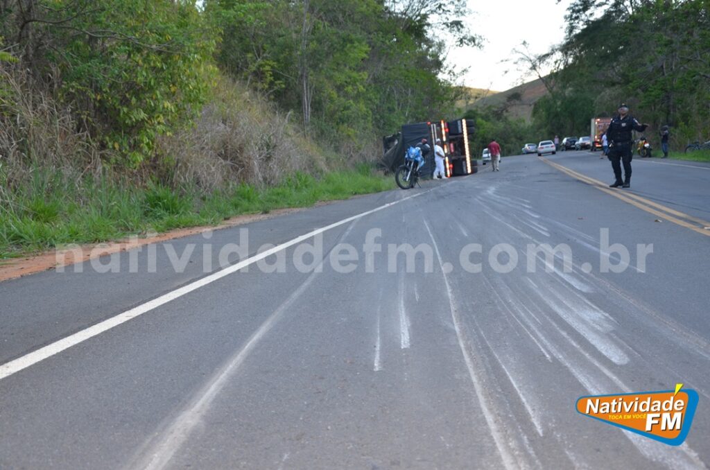 Uma carreta Scannia com placa de São João do Manhuaçu (MG), tombou no final da tarde desta segunda-feira (14), na RJ 220, zona rural de Natividade. O motorista que não teve a identidade confirmada, perdeu o controle da direção do veículo ao não conseguiu concluir a curva fechada na altura do acesso à Fazenda do Triunfo, próximo dos limites do município com Porciúncula, se arrastando por cerca de 50 metros, até parar no acostamento.