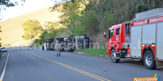 Uma carreta Scannia com placa de São João do Manhuaçu (MG), tombou no final da tarde desta segunda-feira (14), na RJ 220, zona rural de Natividade. O motorista que não teve a identidade confirmada, perdeu o controle da direção do veículo ao não conseguiu concluir a curva fechada na altura do acesso à Fazenda do Triunfo, próximo dos limites do município com Porciúncula, se arrastando por cerca de 50 metros, até parar no acostamento.