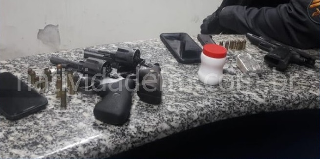 Instantes depois na comunidade do Morro do Querosene, mais dois revólveres calibre 38, cinco munições e um sacolé de cocaína foram encontrados dentro de um dos imóveis. Dos quatro elementos apresentados na delegacia, os dois acabaram autuados com base na Lei do Desamamento e aguardam transferência ao sistema prisional.