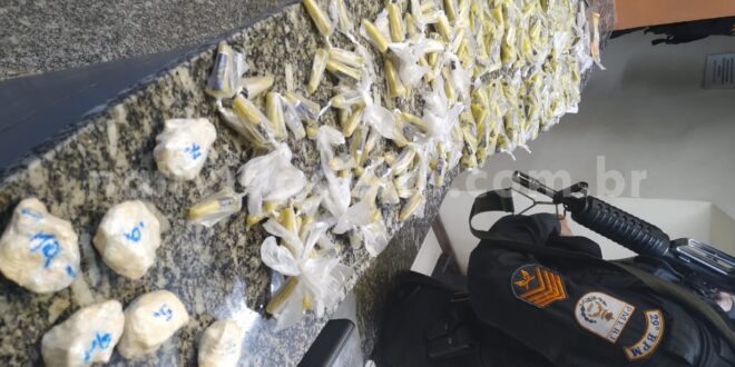 Elemento é preso transportando centenas de pinos e pasta passe de cocaína para Porciúncula