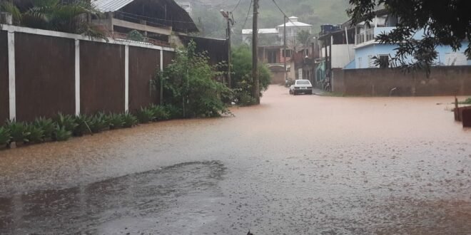A forte chuva que atingiu Natividade no meio da manhã desta sexta-feira (24), voltou a provocar alagamentos em ruas da cidade e um dos pontos mais afetados, foi o bairro Morada do Engenho. De acordo com a Defesa Civil Municipal, a precipitação de cerca de 20mm em curto espaço de tempo, causou diversos transtornos. O Rio Carangola, está próximo do nível de transbordo que é de 5,15 metros. Na última aferição, por volta do meio-dia, a marca batia 4,50 metros, ou seja, cerca de 65 centímetros da cota máxima.