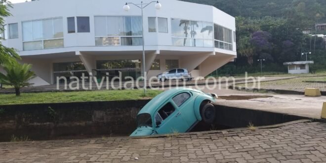 Ainda abalados com o desmoronamento de sua Igreja Matriz, moradores de Varre-Sai de depararam com uma cena diferente nesta sexta-feira (14). Bem em frente à prefeitura,  na Rua Francelino Bastos França, estava um Fusca de cor azul, parcialmente caído no ribeirão que corta a área central da cidade. Não há registro de feridos, como também ainda não se conhece as circunstâncias do acidente.