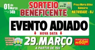 A possibilidade de chuva neste final de semana, provocou o adiamento do sorteio beneficente da APAE/Natividade, inicialmente previsto para este domingo (01), na Praça Maria Altina, no Balneário. Em reunião no início da tarde deste sábado (29), os organizadores defiram a nova data para 29/03 no mesmo local. Da redação da Rádio Natividade