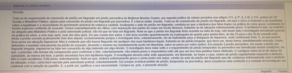 De acordo com o magistrado, não obstante o crime ter sido grave, a prisão em flagrante foi ilegal, pois se deu pelo menos dois dias após o feminicídio, o que não configura flagrante. Na audiência, o Ministério Público solicitou a conversão para a prisão preventiva, o que foi negado pelo magistrado, que determinou a imediata soltura do acusado, detido em Natividade, que em depoimento na 143ª DP, confessou o crime. O MP informou que vai representar pela preventiva no plantão judiciário.
