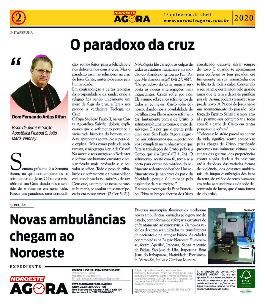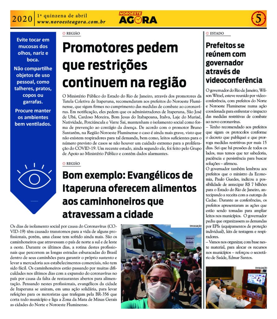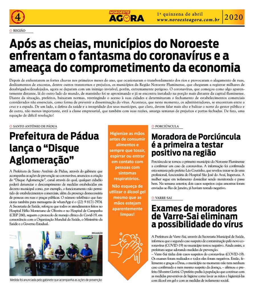 Circulou neste final semana a segunda edição do jornal impresso “Noroeste Agora”, na qual são abordados diversos temas da região, em especial o coronavírus, que tanto tem preocupado milhões por todo o Brasil. Boa leitura!