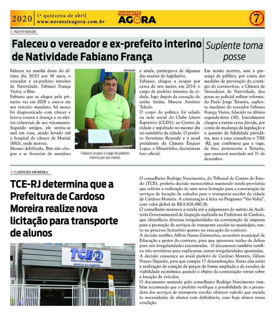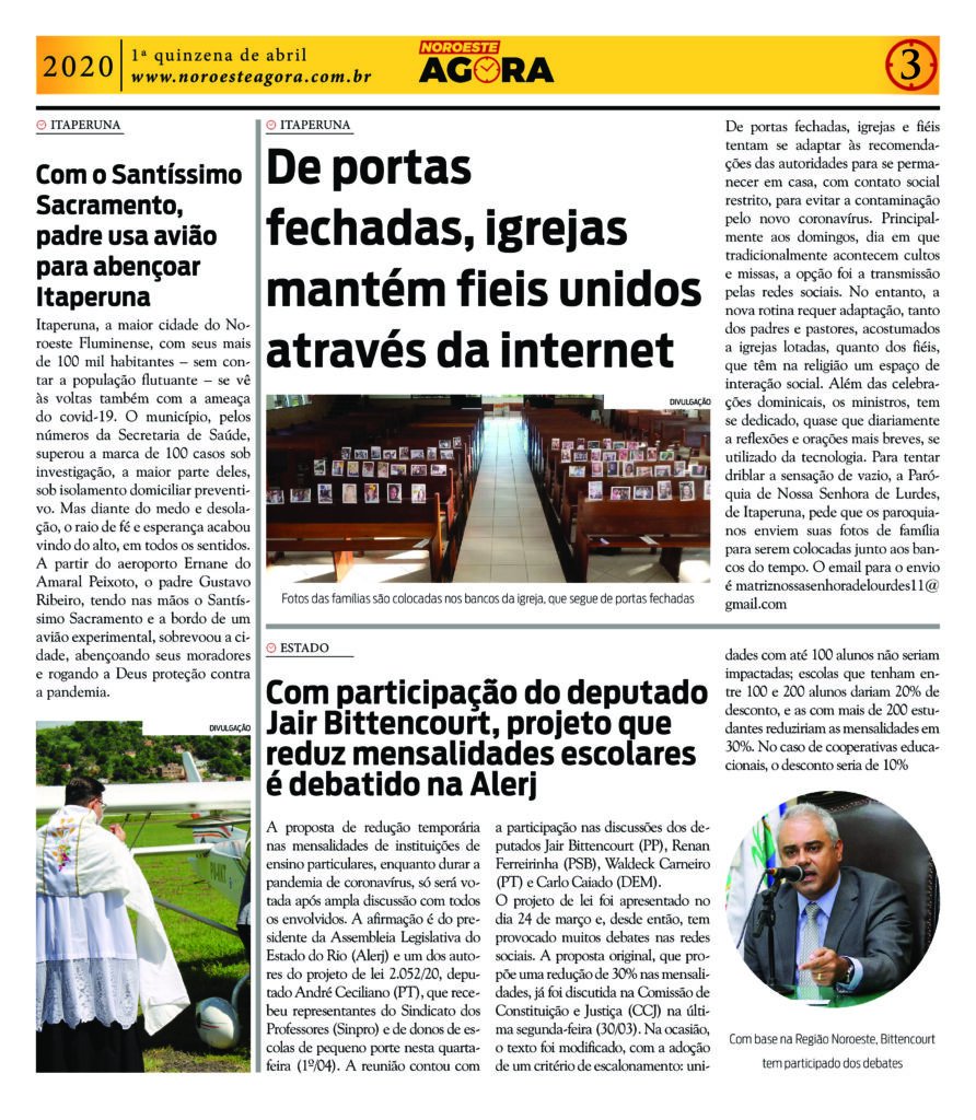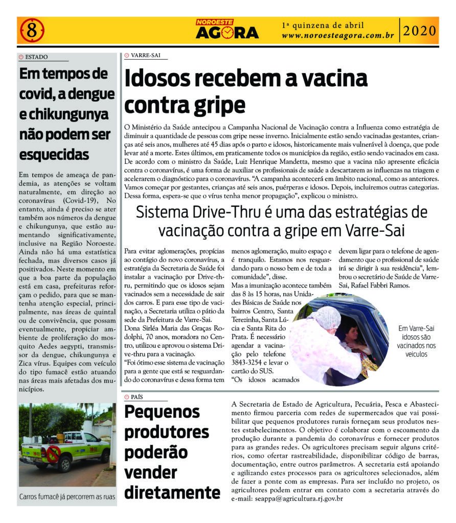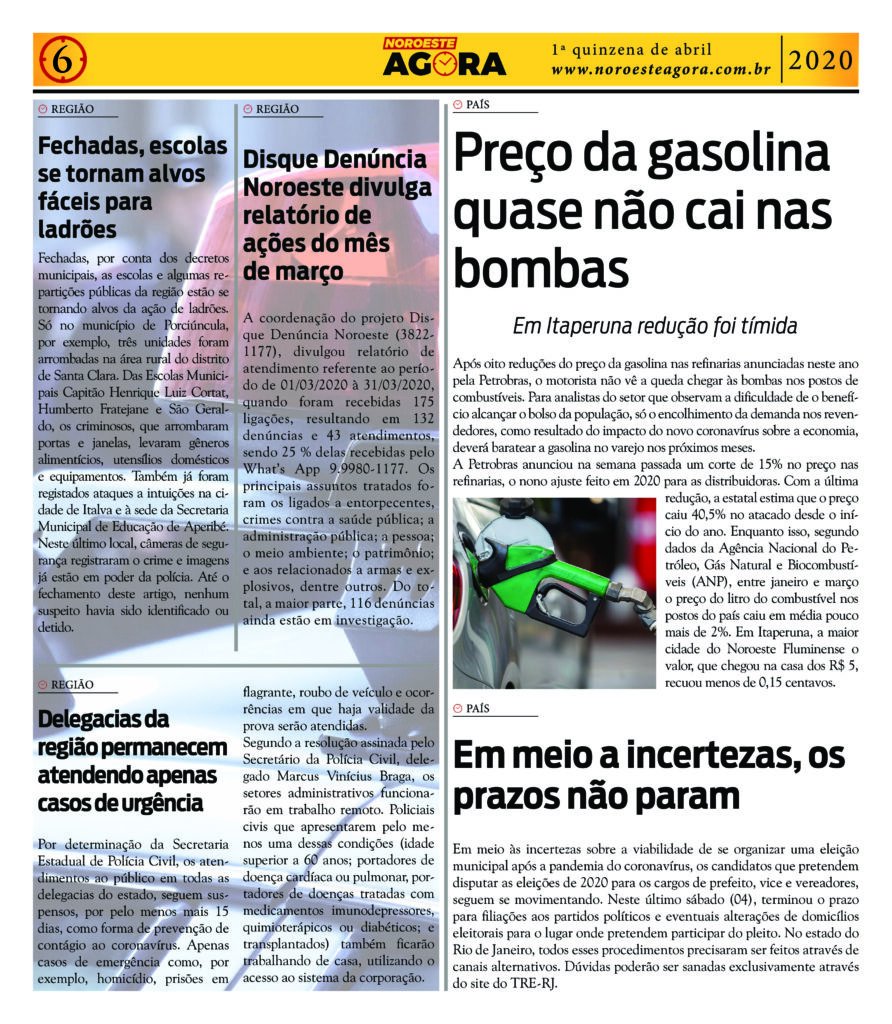 Circulou neste final semana a segunda edição do jornal impresso “Noroeste Agora”, na qual são abordados diversos temas da região, em especial o coronavírus, que tanto tem preocupado milhões por todo o Brasil. Boa leitura!