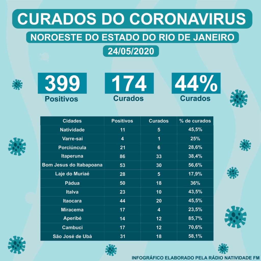 Até o fechamento dos números, Itaperuna seguia liderando as estatísticas, seguida de Bom Jesus do Itabapoana e Santo Antônio de Pádua. Na média, 44% dos pacientes já estão considerados curados e o melhor índice de recuperação, pertence a Aperibé, onde 85% da pessoas que testaram positivo já retomaram à vida normal. Contudo, na outra ponta, está Laje do Muriaé, com apenas 17% de recuperação. Veja a situação de cada cidade: