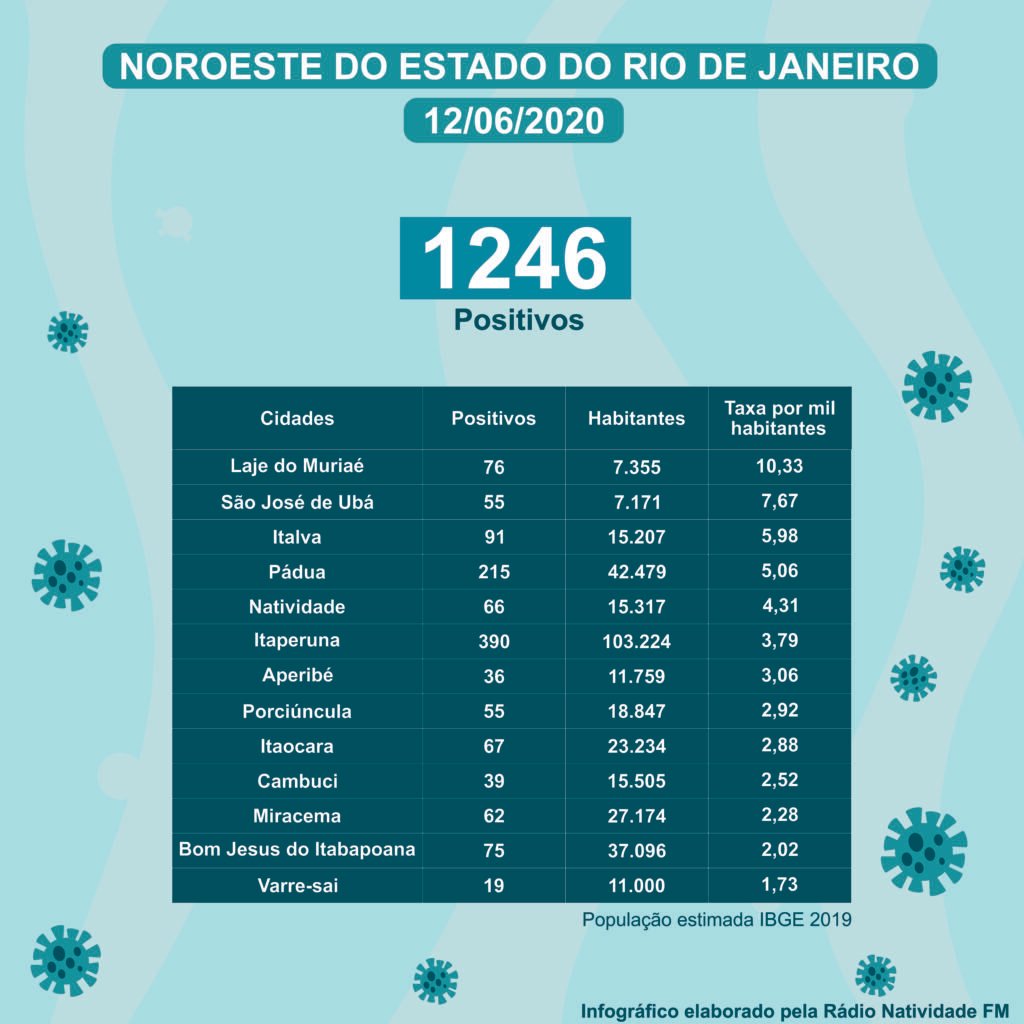 Dados divulgados pelas secretarias de saúde dos 13 municípios do Noroeste Fluminense, até a noite desta sexta-feira (12), e compilados pelo jornalismo da Rádio Natividade, indicam que Laje do Muriaé ocupa o maior índice de pacientes infectados pela covid-19 por cada mil habitantes. Por lá a taxa atinge a marca de 10,33 seguida de 7,67 de São José de Ubá. Natividade está na 5ª posição com 4,31 e a menor taxa é de Varre-Sai que cravou 1,73. Veja a situação de cada município: