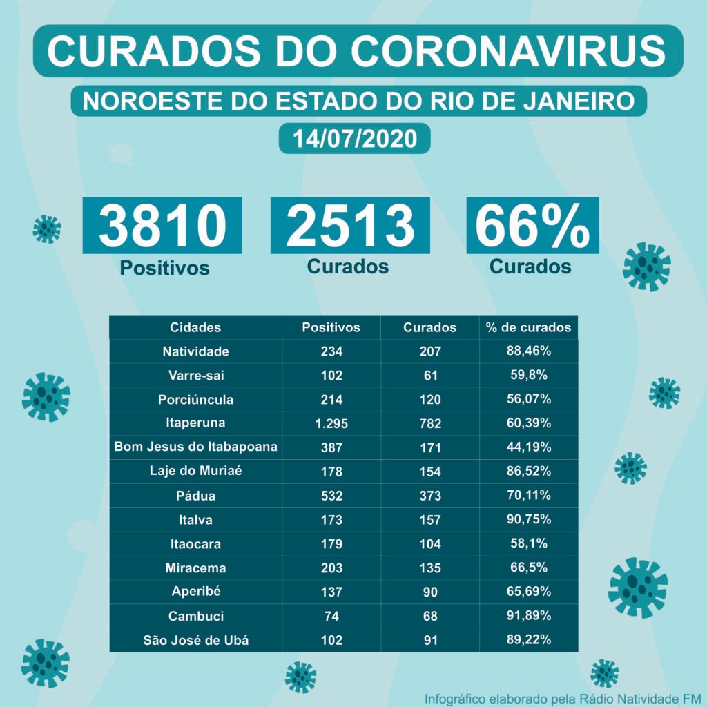 Na região, segundo dados consolidados até a noite desta última terça-feira (14), eram 3.810 pacientes contaminados, 2.513 destes já curados, ou seja, 66%. Na liderança está Cambuci, com 91,89%, seguida de Italva com 90,75% e São José de Ubá com 89,22%. Natividade ocupa a 4ª posição, com 88,46%, enquanto que o pior índice pertence a Porciúncula, 56,07%, que está abaixo da média. Veja a situação de cada município:
