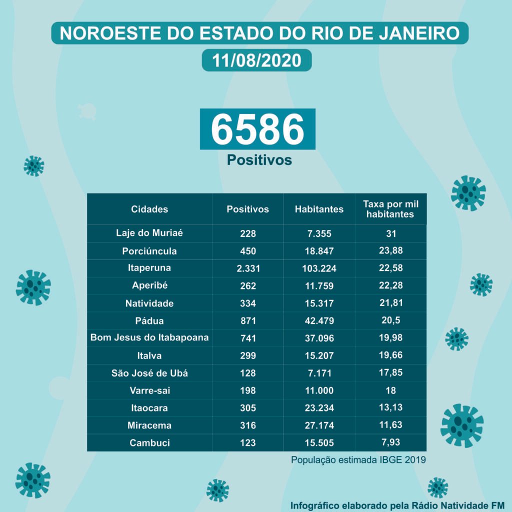 Até data, a liderança permanece com Laje do Muriaé, que conta com 7.355 habitantes e tem média de 31 contaminados para cada mil, enquanto que a vice-liderança continua com Porciúncula, com índice de 23,88/mil, seguida de Itaperuna, que assumiu a terceira colocação com 22,58. Na situação mais tranquila entre todos da região permanece Cambuci, com 7,93. O município até o fechamento dos dados o único (*) que ainda não registrou nenhuma morte por conta da doença.
