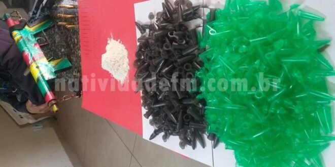 Alertados por denúncias, os agentes realizaram buscas pelo local, encontrando escondidos em um barril de plástico, o artefato com dois carregadores com capacidade de 30 munições cada, certa quantidade de pó branco (inconclusivo segundo a perícia), além de 646 pinos vazios, geralmente usados para endolar cocaína.