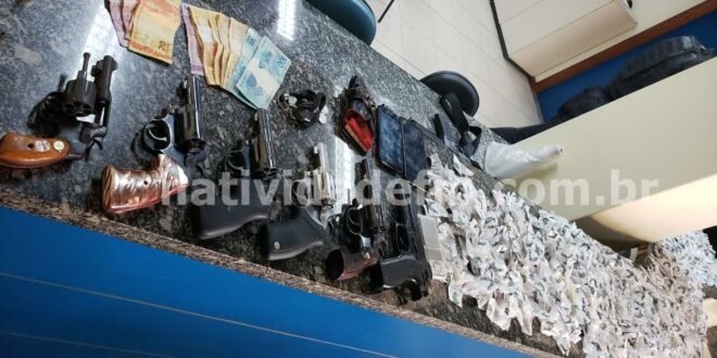 Militares do 29º BPM que já monitoravam a residência de um dos envolvidos, cumpriram mandado de busca expedido pela Justiça, encontrando no local, escondidos dentro guarda-roupas, quatro revólveres calibre 38, outro de calibre 32, simulacro de pistola, oito munições de calibre 38, 1.029 pinos de cocaína, balança de precisão, dois celulares e R$ 402.