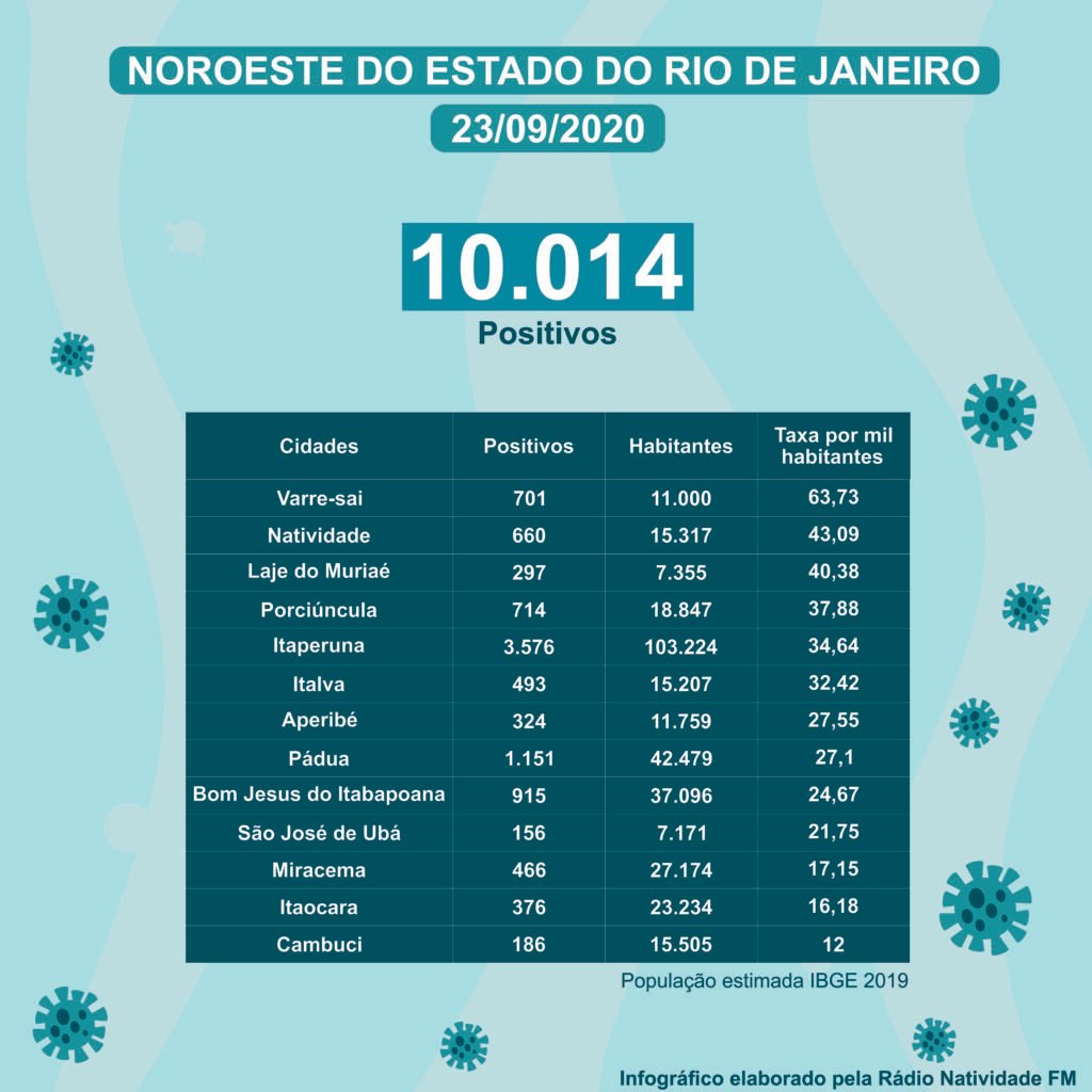 No topo, permanece o município de Varre-Sai, com 63,73 infectados a cada mil habitantes, seguido de Natividade com 43,09. Confira a situação de cada cidade: