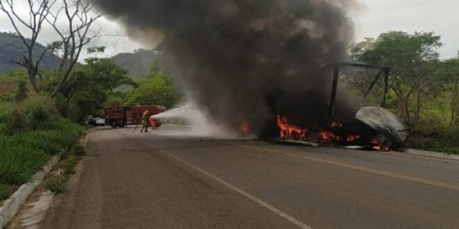 Uma carreta carregada de azeitona pegou fogo nesta terça-feira (13) na BR 356, na altura da Pratinha, trecho que liga Muriaé a Itaperuna. O Corpo de Bombeiros, depois de aproximadamente uma hora e meia, conseguiu controlar as chamas, mas o veículo ficou todo destruído. O motorista que não se feriu, não soube explicar o motivo do incêndio. Durante a ação dos militares, o trânsito ficou parcialmente interditado durante parte da manhã. No inicio da tarde, o veículo será removido.
