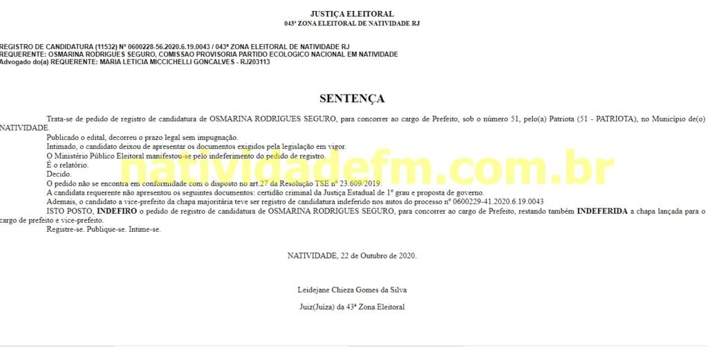 Em sentença prolatada nesta quinta-feira (22), a juíza Leidejane Cheiza Gomes da Silva, da 43 Zona Eleitoral, indeferiu o registro da candidata a prefeita de Natividade pelo Patriota Osmarina Rodrigues e seu vice, Marco Antônio.