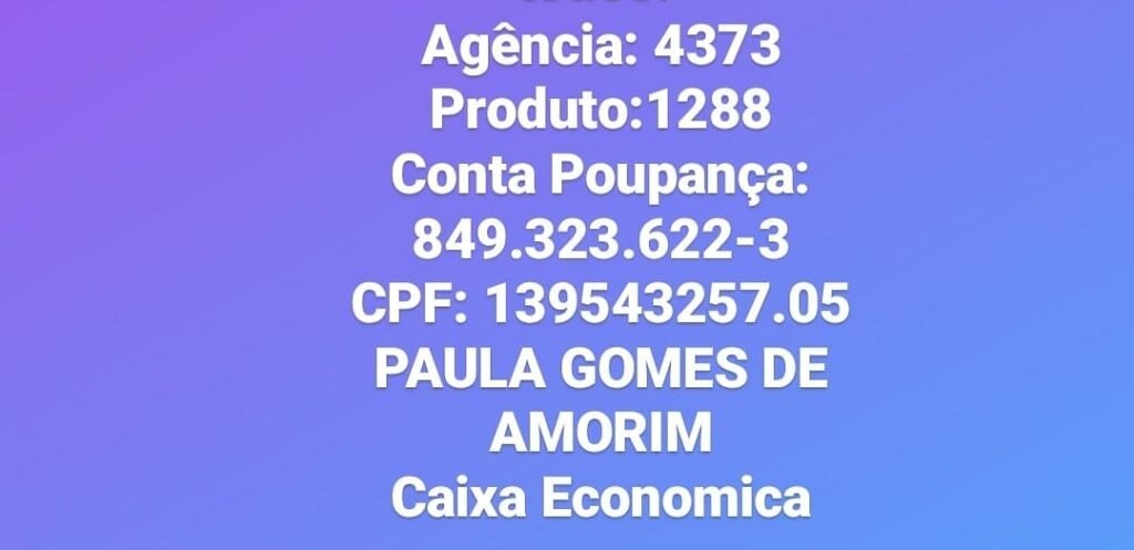 Quem puder ajudar, com qualquer valor, poderá efetuar depósito na conta abaixo em nome de Paula Gomes de Amorim ou ainda através da plataforma Vakinha Virtual. Mais informações: (22)9 8152-2206/ Val e (22)9 9605-6290/Paula.
