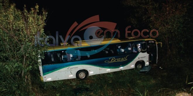 Um ônibus da Auto Viação Brasil saiu da pista na altura do km 61 da BR 356, entre Itaperuna e Italva, no trecho conhecido por “Quebra Carreta” e desceu uma ribanceira de quase 30 metros. O coletivo não chegou a tombar, mas bombeiros de Italva e várias ambulâncias estiveram no local para o socorro às vítimas, levadas para o Pronto Socorro de Italva com ferimentos leves.