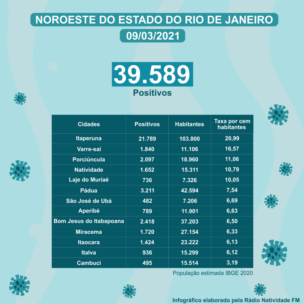 Levantamento realizado pela Rádio Natividade até a noite desta terça-feira (09), com base em informações divulgadas pelas 13 Secretarias Municipais de Saúde da Região, revela que quase 40 mil pessoas já foram infectadas pela covid no Noroeste Fluminense. Neste cenário, Itaperuna que teve praticamente 21% de toda a sua população contaminada lidera a lista, seguido de Varre-Sai com 16, 57 %. O menor índice pertence a Cambuci, apenas 3,19 %.