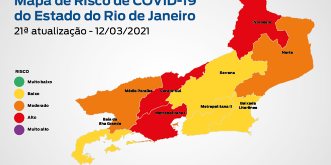 A 21ª edição do Mapa de Risco da Covid-19 mostra que a situação da pandemia se encontra em risco moderado (laranja) no Estado do Rio de Janeiro. As regiões Centro-Sul, Metropolitana I e Noroeste estão classificadas com risco alto (bandeira vermelha), e as regiões Médio Paraíba e Norte estão classificadas com risco moderado (bandeira laranja). As demais regiões foram classificadas em risco baixo (bandeira amarela), conforme mapa de risco da Covid-19. A análise compara a semana epidemiológica 08 (de 21 a 27 de fevereiro) com a 06 (07 a 13 de fevereiro) de 2021.