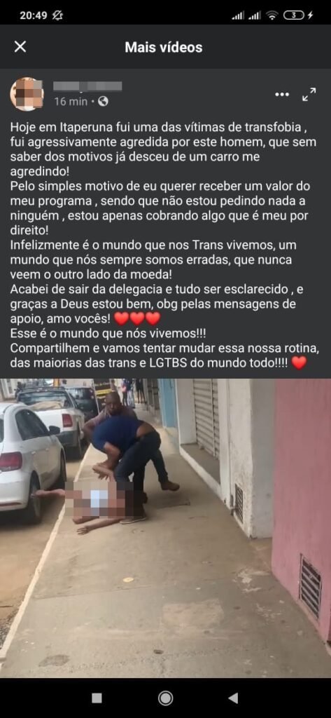 Através das redes sociais, a trans se defendeu, alegando que não cometeu nenhum crime, mas apenas cobrou por um programa realizado e que foi agredida sem motivo algum e que foi vítima de transfobia. Veja: