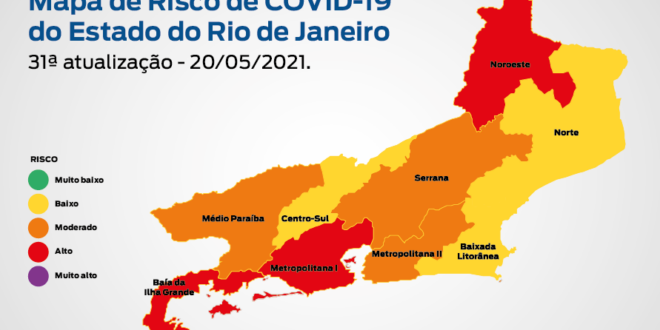 A 31ª edição do Mapa de Risco da Covid-19, divulgada nesta sexta-feira (21/05) pela Secretaria de Estado de Saúde (SES), mostra que o Estado do Rio de Janeiro está com bandeira laranja (risco moderado de contrair a doença). Há melhora do cenário epidemiológico no período analisado, com três regiões com bandeira amarela (risco baixo): Norte, que permanece nesta classificação; Centro-Sul, que estava antes em bandeira laranja; e Litorânea, que estava em bandeira vermelha (risco alto) na última divulgação. As regiões Metropolitana I, Baía da Ilha Grande e Noroeste permanecem na vermelha. Médio Paraíba, Serrana e Metropolitana II estão em bandeira laranja. A análise compara a semana epidemiológica 18 (2 a 8 de maio) com a 16 (18 a 24 de abril) de 2021.