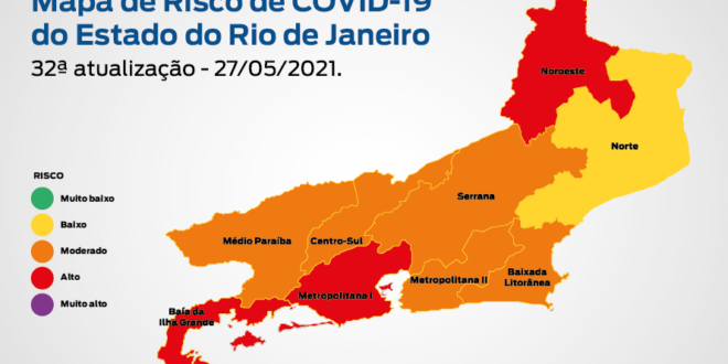 A 32ª edição do Mapa de Risco da Covid-19, divulgada nesta sexta-feira (28) pela Secretaria de Estado de Saúde, mostra que o Estado do Rio de Janeiro se mantém em bandeira laranja (risco moderado de contrair a doença). Há piora do cenário epidemiológico em duas regiões que estavam com bandeira amarela (risco baixo) passando para a laranja: Baixada Litorânea e Centro-Sul. As regiões Metropolitana I, Baía da Ilha Grande e Noroeste permanecem com risco alto (bandeira vermelha). Médio Paraíba, Metropolitana II e Serrana continuam com bandeira laranja. E o Norte Fluminense segue na bandeira amarela.