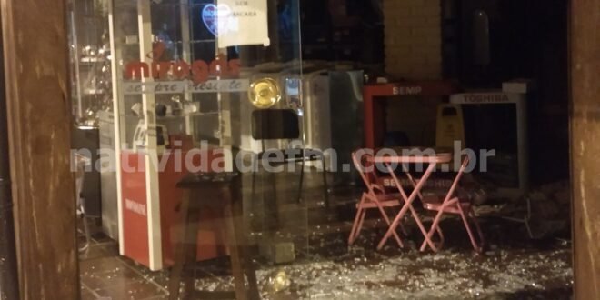 Uma loja – Miragás – foi alvo de arrombamento e furto na madrugada desta segunda-feira (14), na área central de Miracema. Testemunhas que acionaram o serviço de radiopatrulha do 36º BPM relataram terem ouvido forte barulho e quando os militares chegaram ao endereço, na Rua Marechal Floriano, encontraram a vidraça estilhaçada e de onde, segundo o proprietário, teriam sido levados relógios, além de uma TV. Um carro de característica não definida teria sido usado no crime e imagens de câmeras de segurança estão sendo avaliadas. As investigações prosseguem sob registro da 137ª DP.