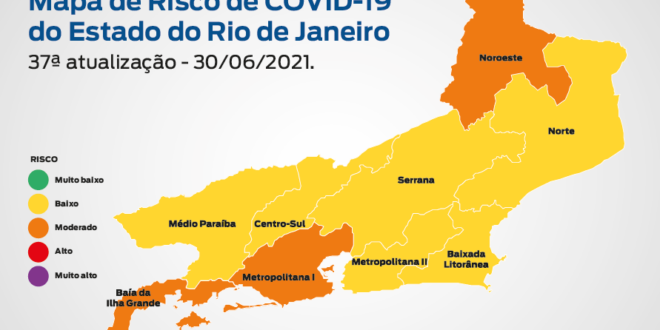 A 37ª edição do Mapa de Risco da Covid-19, divulgada nesta sexta-feira (02) pela Secretaria de Estado de Saúde, mostra que o estado do Rio de Janeiro permanece com risco baixo de contrair a doença, com bandeira amarela. O estado manteve melhora do cenário epidemiológico em comparação à análise passada, com três regiões com bandeira laranja (risco médio) e as outras seis com amarela.