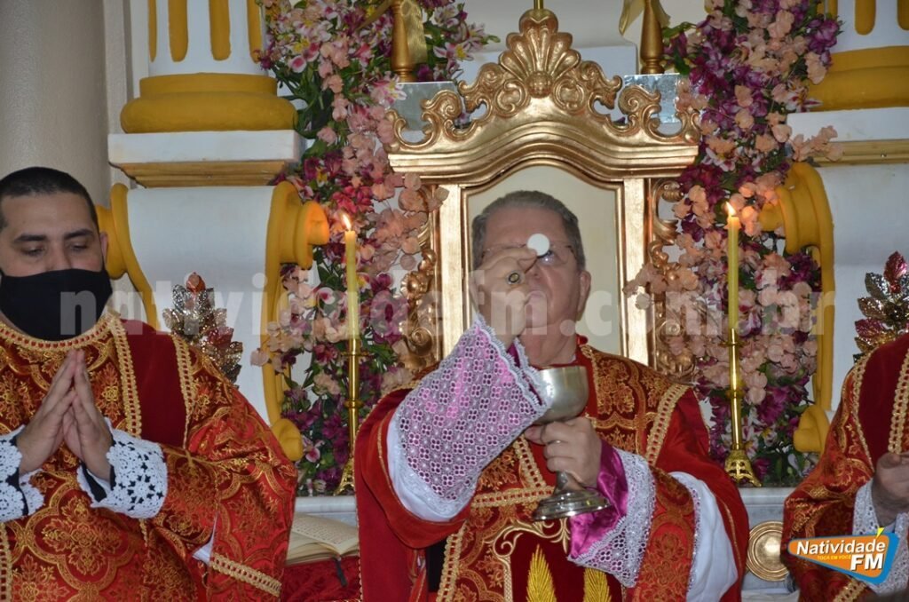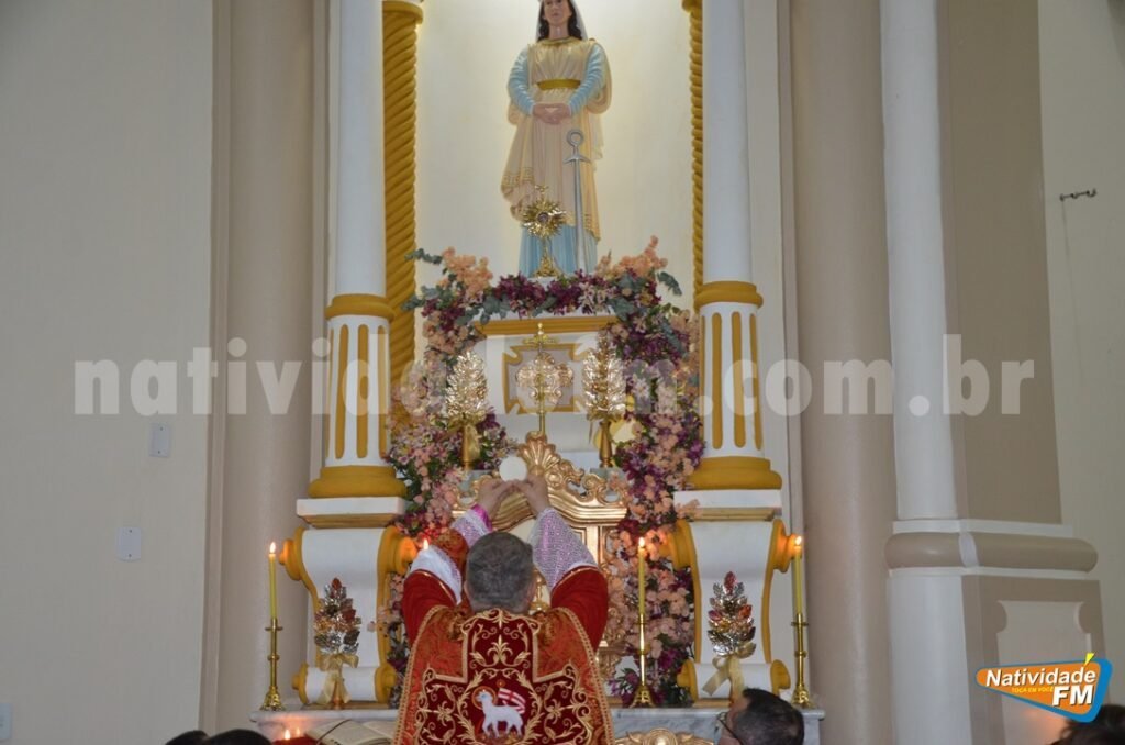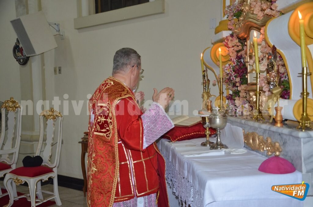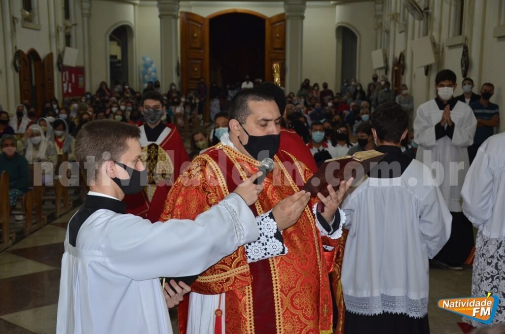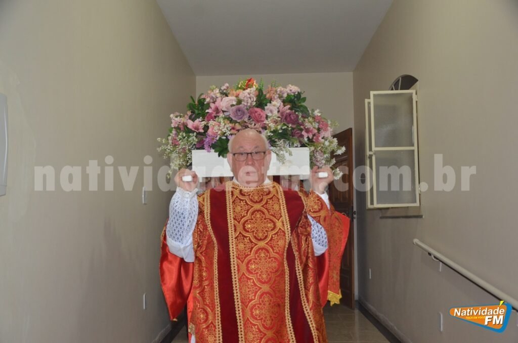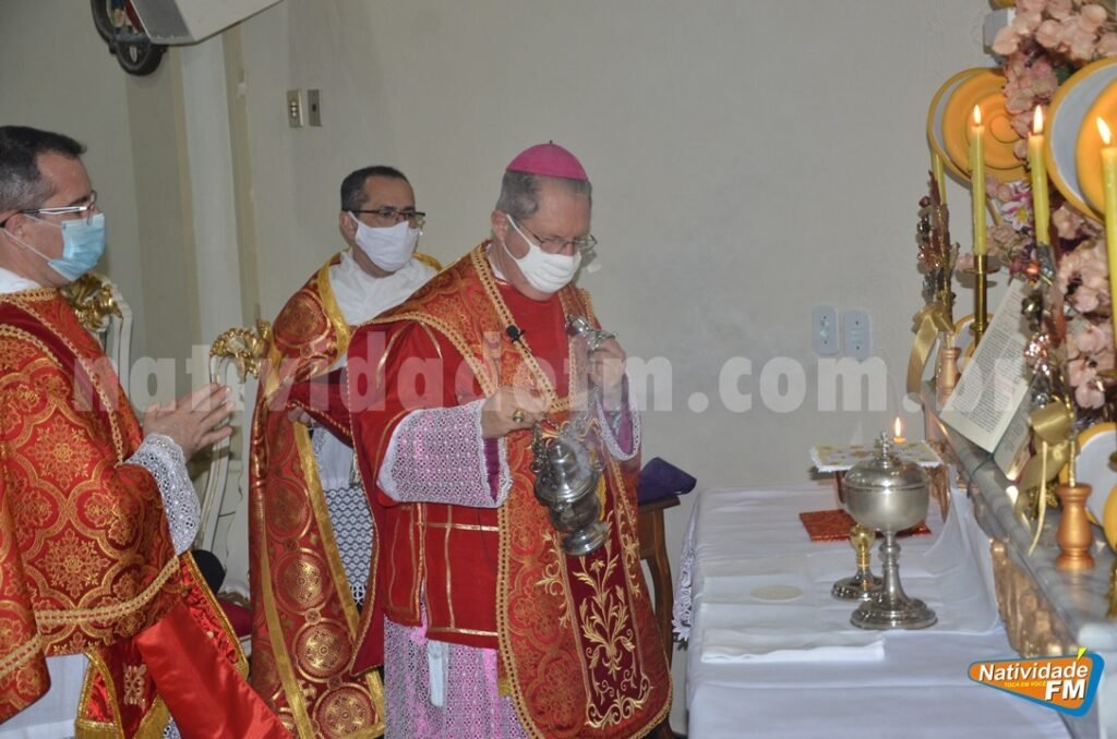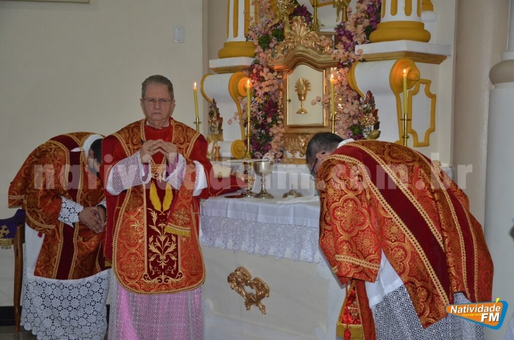 O novo local sagrado que recebeu as relíquias da jovem mártir, além de Santa Luzia e São Brás, protetores dos olhos e garganta, respectivamente, foi ungido pelo bispo D. Fernando Rifan, que na sequencia, oficiou a Santa Missa Solene, concelebrada pelos padres Adriano Botura, aniversariante do dia e Marco Antônio Assunção, que o sucederá a partir deste final de semana. Pelo menos outros seis sacerdotes, também estiveram presentes e ao final, emocionado, Pe. Adriano, transferido recentemente para a cidade de São Fidélis, recebeu homenagens dos paroquianos, com direito a bolo e “parabéns pra você”.
