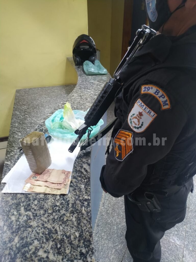 Ação conjunta de agentes da 139ª DP e militares do 29º BPM resultou na prisão de um suspeito de tráfico de drogas na tarde desta quinta-feira (07), na comunidade Nova Caeté, Porciúncula. De posse de mandado de busca expedido pela Justiça, a equipe se deslocou até a Rua Elias Habib, onde depois de vasculharem a residência de João Marcos Ferreira de Araújo, de 25 anos, encontraram um tablete de maconha e R$ 70.