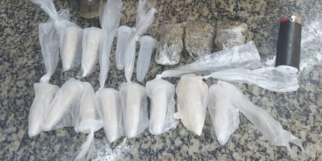 Um suspeito de tráfico de entorpecentes foi preso na tarde desta quarta-feira (03), na parte alta central de Itaperuna. Militares do 29º BPM em deslocamento pela naFrancisco Severiano, no Morro do Castelo, abordaram Yagor Rosa da Silva, de 28 anos, que trafegava de moto e com quem encontraram três buchas de maconha e dez pinos de cocaína. Autuado em flagrante na 143ª DP, o envolvido deve ser transferido ao sistema prisional.