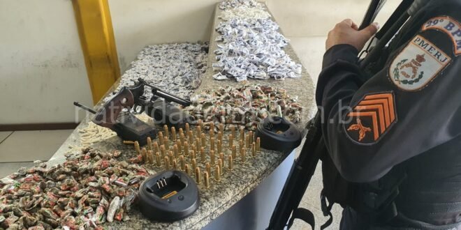 No interior deste,s eram mantidos, dois rádio comunicadores com carregadores e fones de ouvido, o revólver calibre 38, 56 munições, 3.424 pinos e 357 papelotes de cocaína, 1.106 buchas de maconha, além de 330 pedras de crack. A informação dava conta de que o material pertenceria a um suposto gerente do crime organizado local, que, contudo, não foi encontrado na área dos fatos. O registro seguiu para a 143ª DP, que apura.