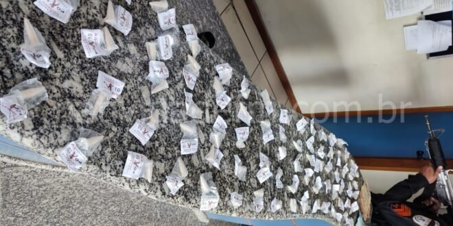 A equipe realizava patrulhamento pela Rua Alcebíades Mendes Linhares, quando se deparou com Matheus da Silva Carvalho, de 26 anos, que segundo os agentes, ainda tentou se livrar da sacola, na qual transportava 80 pinos, totalizando cerca de 150 gramas de cocaína, com adesivo alusivo a facção criminosa, além de R$ 1.500.