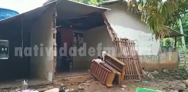 A forte de chuva que atingiu o município de Natividade entre o final da tarde e noite desta quarta-feira (02), causou muitos estragos e um dos pontos mais castigados foi o distrito de Ourânia, onde entre outros, uma residência – entre muitas atingidas – ficou quase que completamente destruída pela força da água (veja abaixo). A zona rural, também sofreu bastante, com imóveis atingidos e vias de acesso destruídas.